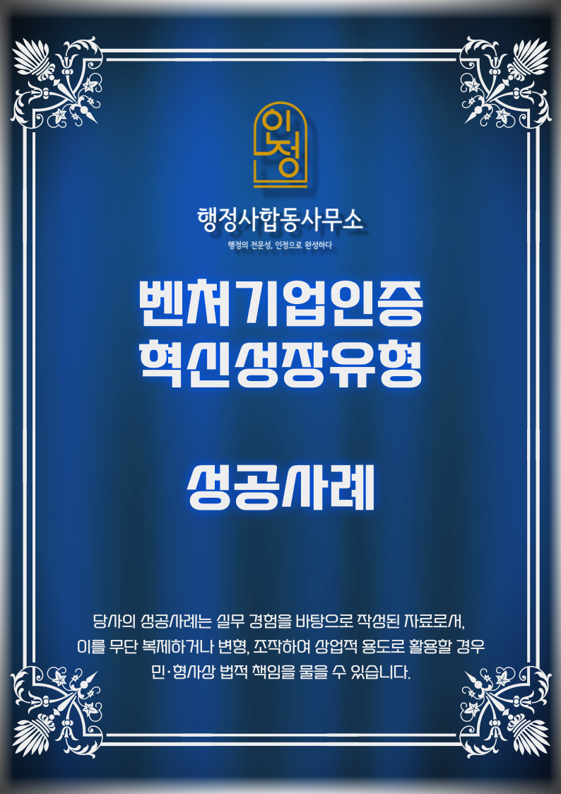 저희 인정행정사합동사무소는 기업 상황을 분석하여 혁신성장유형으로 신청 전략을 수립하였고, 사업계획서 작성, 특허증빙, 연구개발활동 정리를 체계적으로 지원했습니다.