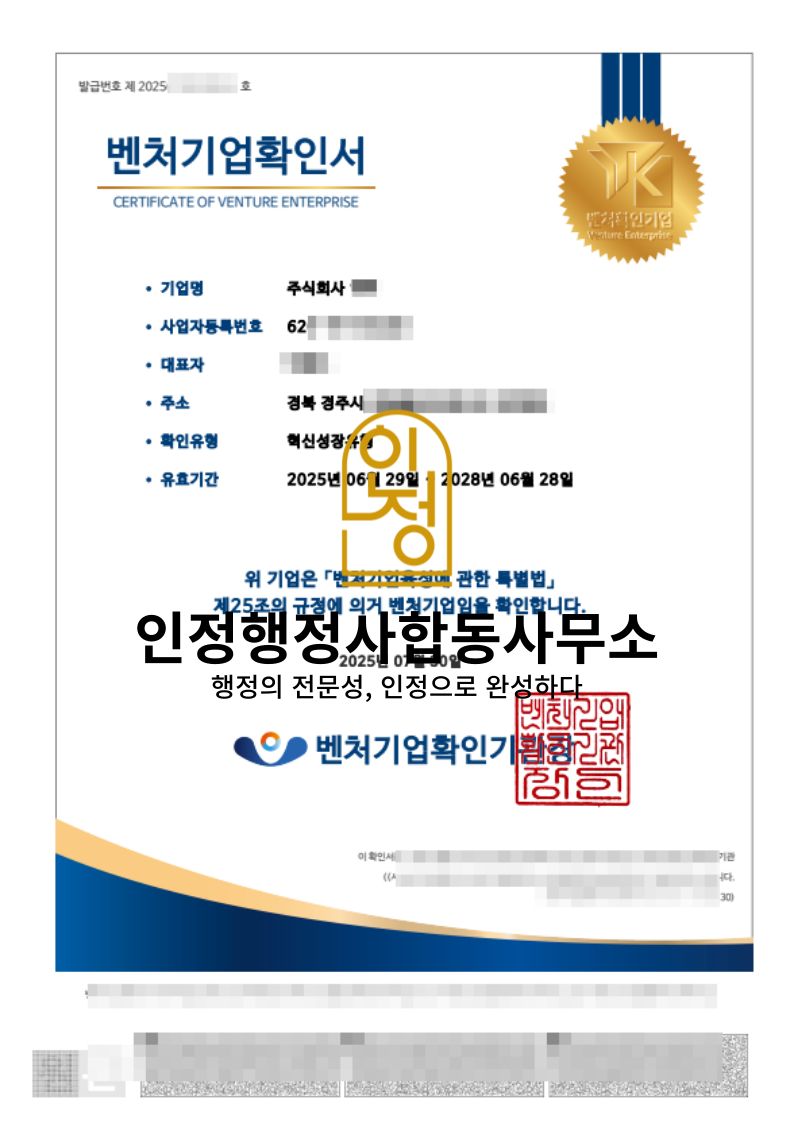 의뢰 기업은 기술혁신형 중소기업으로, 정부지원사업 참여와 조달청 가점 확보를 위해 벤처기업인증(벤처기업확인서) 발급을 준비하셨습니다.