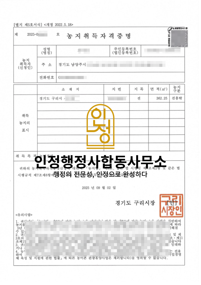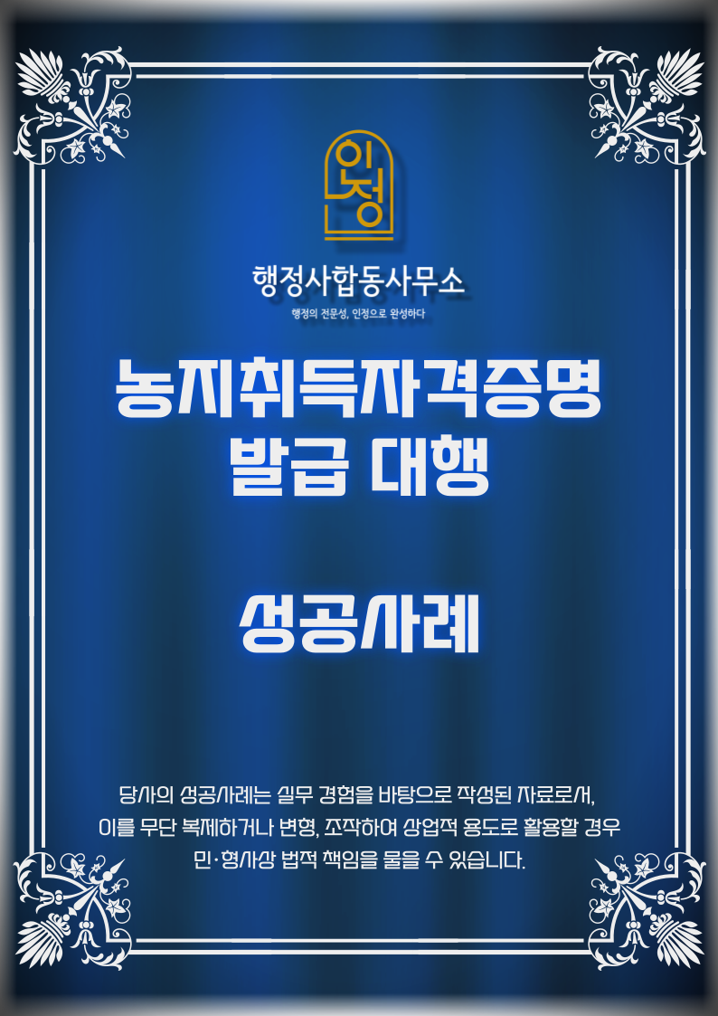 의뢰인은 농업 경영을 위해 농지를 매입하려 했으나, 「농지법」에 따라 필수로 요구되는 농지취득자격증명 발급 과정이 복잡해 어려움을 겪고 있었습니다. 특히 실제 경작 의사와 계획을 입증할 서류 준비에서 난항을 겪으며 저희 인정행정사합동사무소에 도움을 요청하셨습니다.
